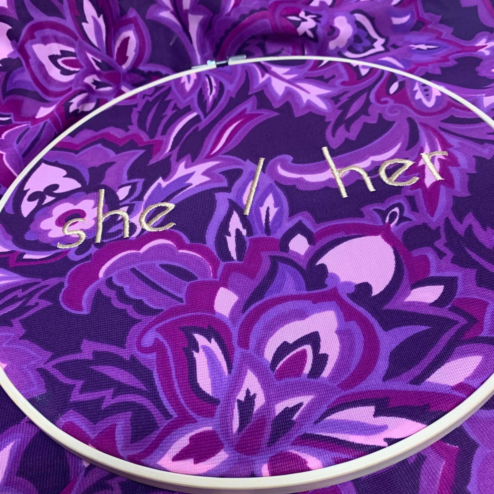 "She/ Her" Subversive Embroidery Pronoun Wall Art - purple floral